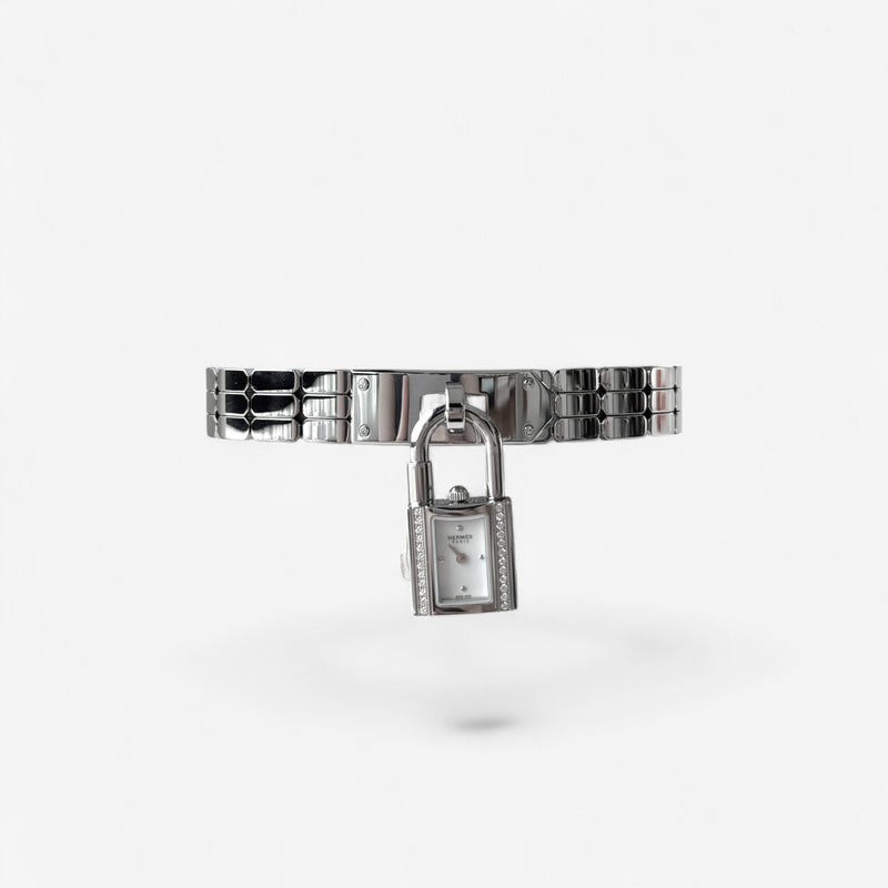 The Hermès Kelly Watch is one of the Maison's most singular creations — a timepiece that blurs the boundary between watchmaking and jewellery, drawing direct inspiration from the iconic padlock of the Kelly bag. This Mini model, measuring just 16 x 16mm, is crafted entirely in polished steel and set with 24 brilliant-cut diamonds totalling 0.151 carats around the case, with a further four diamonds set into the steel bracelet plate. A single diamond at 6 o'clock serves as a discreet Hermès signature on the white lacquered dial, which catches the light with its sparkling, glitter-flecked finish.
